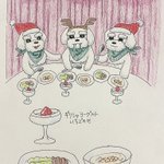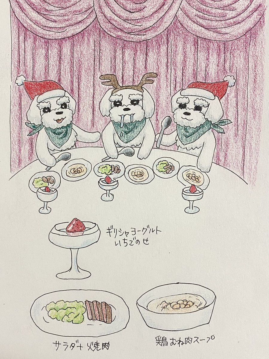 今日のお絵描き。メリークリスマス🎁🎄今夜はカリカリフード無しの特別メニューだよ!さぁ、楽しいクリスマスパーティのはじまり🥰💕 #お絵描き #イラスト #アナログ絵 #drawing #illustration #犬 #dog #シュナウザー #schnauzer #クリスマスディナー #ChristmasDinner #クリスマス #christmas