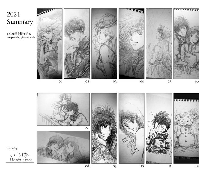前半なんかほとんどアナログしか発掘できんかった。 といわけで白黒アナログので。7月8月は入らないのでちょっとテンプレいじらせていただきました… まくろすじゃないのも入ってるし12月は今描いた。 #今年描いた絵を振り返る #今年描いた絵を晒そう #マクロス #クリーミーマミ #ミカサ