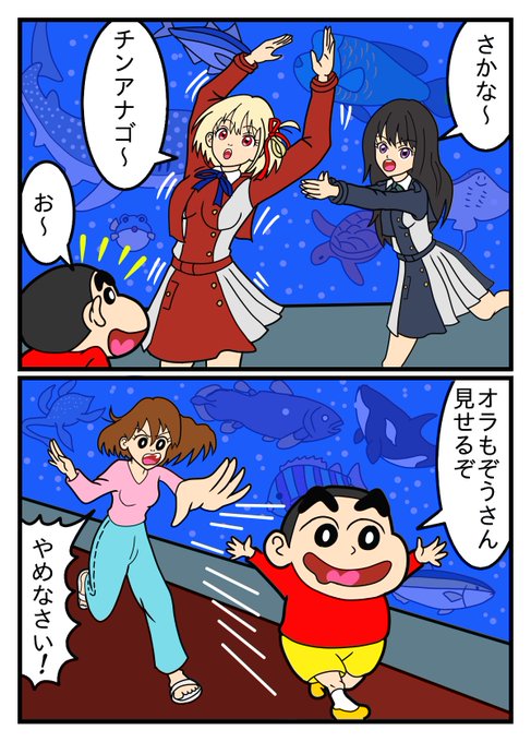 「やはり見られていた」 水族館で不審行動をとってしまった千束とたきな。 誰も気に留めないと思っていたが、よりによって面倒な男に見つかってしまった。 #リコリスリコイル #クレヨンしんちゃん