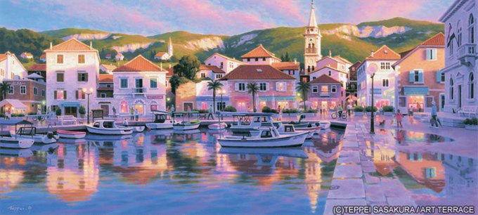 🌟新作原画(#油彩画)を展示中 笹倉鉄平 Teppei Sasakura 『ロヴィニの日の入り~The Sun Setting Over the Sea, Rovinj~』 2022年 #クロアチア 「グリーティングカード」ございます 笹倉鉄平ちいさな絵画館 kaigakan-teppei.net #笹倉鉄平 #アート #絵 #油絵 #アート好きな人と繋がりたい
