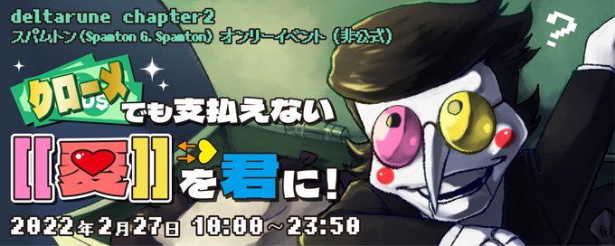 来年2月のスパムトンウェブオンリーイベント『クローメでも支払えない[[愛]]を君に!』のメインビジュアル・ヘッダはこちらとなります! ピクスクのイベントページ公開・サークル募集は11月20日頃までに行う予定です。 イベントのことについてのタグはぜひ #クロ愛 #kroveSpammy をご利用ください!