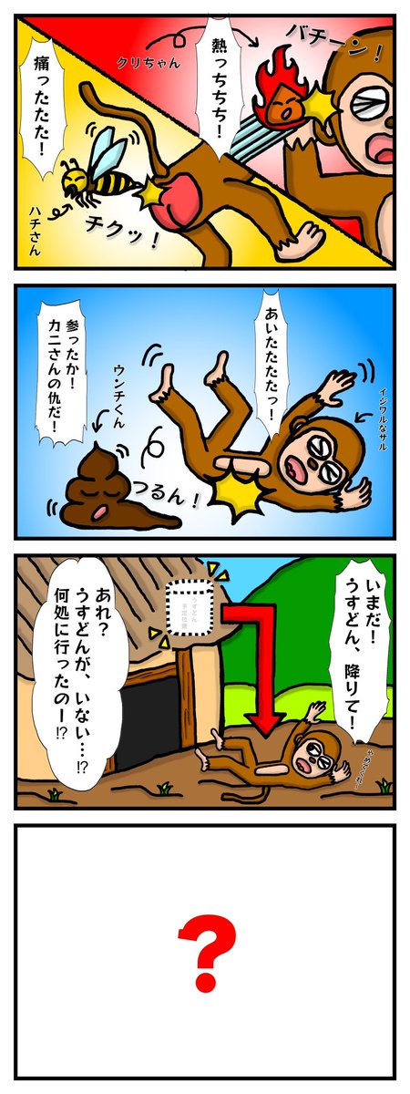 お待たせ久々新作!考えるおとなの…4コマ漫画。第47回「さるかに合戦 平成ver」【問題】 うすどんは何処へ?気になる4コマ目(正解)は…⬇️mongorianthoop.seesaa.net/article/491224… #イラスト好きさんと繋がりたい #イラスト王国 #4コマ漫画 #イラスト #漫画が読めるハッシュタグ #平成 #クールポコ #昔話