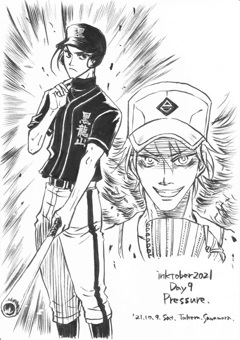 day9 pressure 「この左上のプレッシャーは…」とかがつい浮かぶ😆今ちょっとクーロンズ脳なので4番対エース対決にしてみました😁模写したコマが眉毛帽子で隠れてたので枝毛眉じゃないけどすみません💦 #inktober2021 #inktober2021day9 #インクトーバー #クーロンズボールパレード #クーロンズ_FA