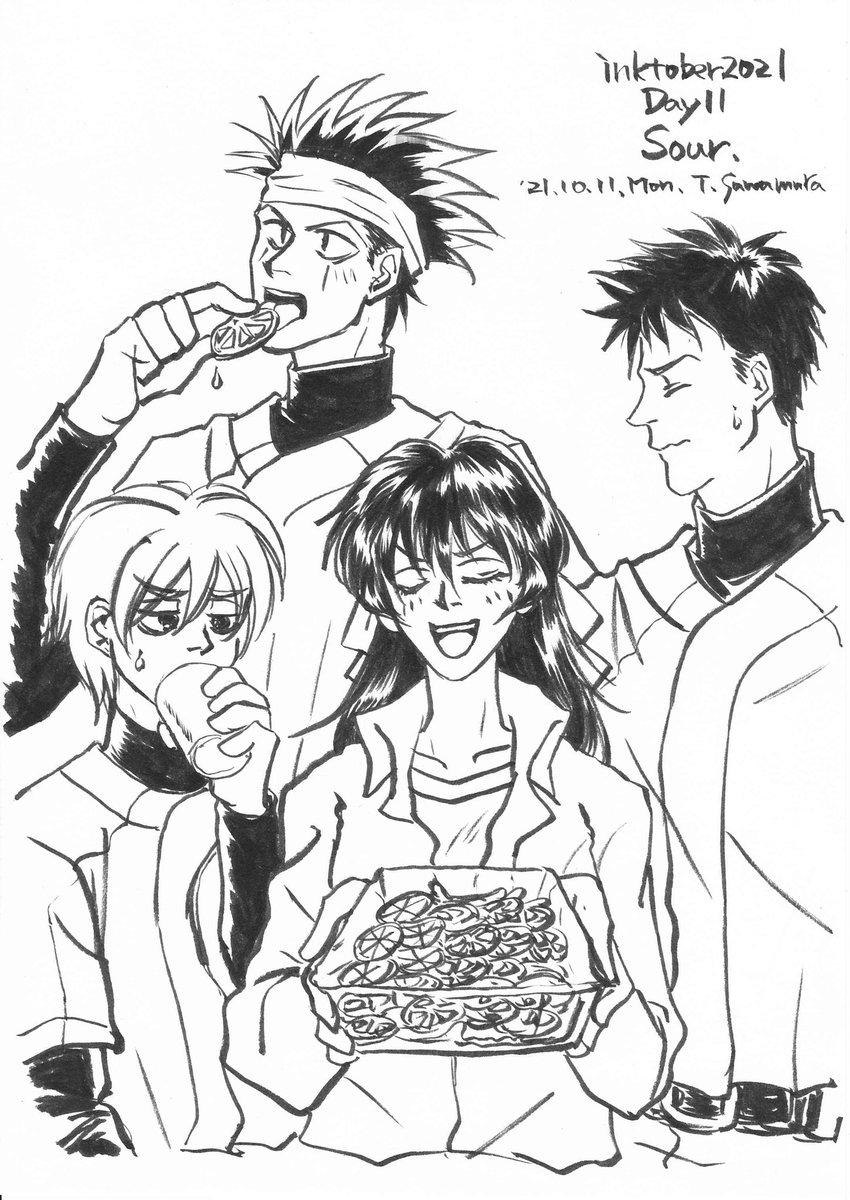day11 sour 遅刻〜😢スポーツの差し入れとゆーとはちみつレモンが浮かぶ😅 寅本くんと洞口くんやっと描けた💦木戸くんは剣くんの次に推しでした😊3巻、みんな自分らしい活躍の仕方しててよかったです💕 #inktober2021 #inktober2021day11 #インクトーバー #クーロンズボールパレード #クーロンズ_FA