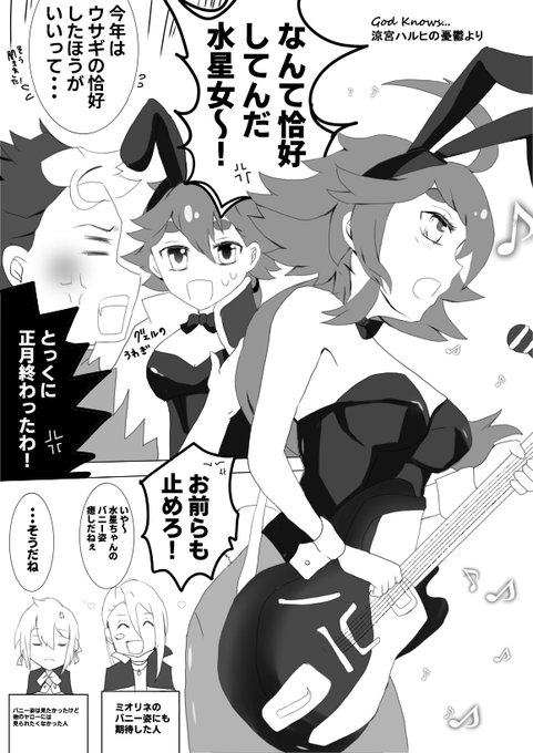 バニー姿のスレッタと御三家。 個人的に御三家で一番オカタイのはグエル先輩だと思う。 ハルヒちゃんのポーズトレスさせていただきました。 第二クールはまさにGodKnows...ですよ。 なんでも許せる方向け・謎時空。 #グエスレ #エラスレ #ガンダム水星の魔女ファンアート