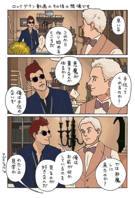 S2ではアジラフェルとクロウリーはまだ同居していないようですが、「天使と悪魔はアルマゲドンの後に同居する」そうなので、どう始まるのか想像しました シリーズになっています よろしければ見てやってください☺️ #GoodOmens #グッドオーメンズ (スレッドに続きます)
