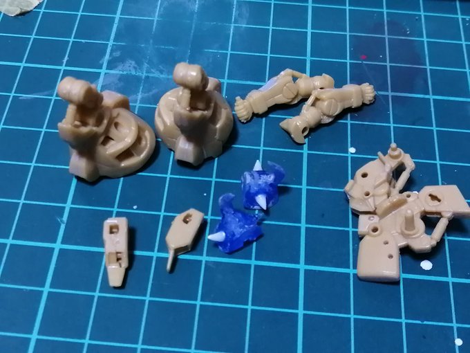 #ガンプラ #グフフライトタイプ #ガンプラ好きと繋がりたい #ガンプラの画像貼るとRTされると聞いて #アーティファクト ディテールの追加はまた後日。 グリップは手首と一緒に作る予定です。 一緒に写ってるのは肘のマガジン様に切り出したプラ板です。