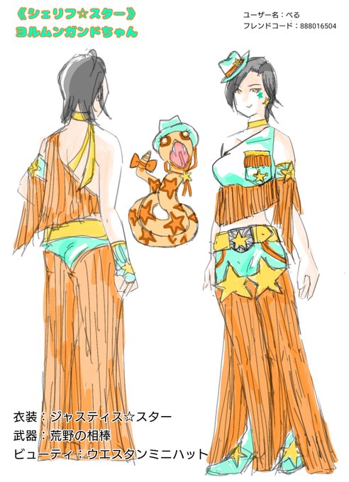 これから鹿狩りの心強い仲間として活躍予定のヨルムンガンドちゃんにシェリフ的な格好をしてもらいました。鹿取り締まる的な気持ちで。 とにかくフリンジまみれです。絵を動かすの大変でいやがられるやつ。 #グラクロ #ラグナロクファンアート
