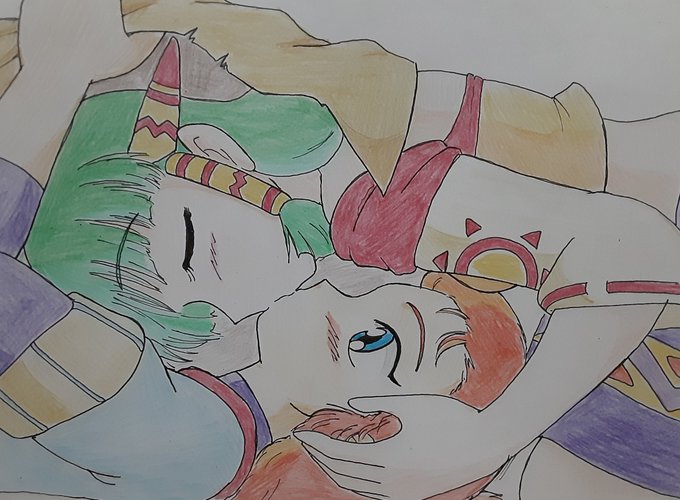 #グランディア 発売25周年! メモリアルパッケージのあれは完全にデキているカップルのやつだろ!という絵です 単純にジャスティンとフィーナにキスさせたかっただけでもある( ゚Д゚) 過去絵と併せてどうぞ twitter.com/kuronyankobaro…