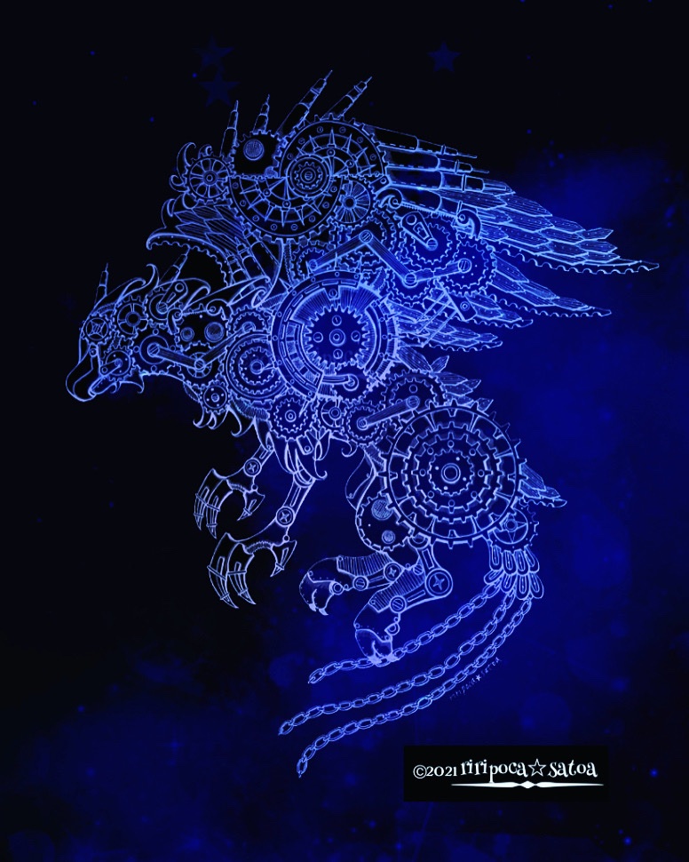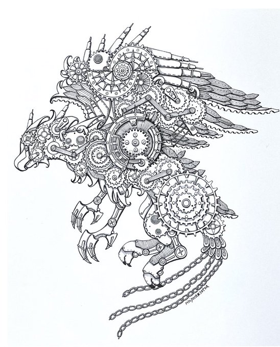 おはようございます✨✨ 肩から肩甲骨にかけて負傷です😭 会社に言える雰囲気でもなく💦 湿布して乗り切ります💪 ⚙グリフォン⚙原画 #スチームパンクイラスト #グリフォン #ペン画 #歯車イラスト #絵描きさんと繋がりたい