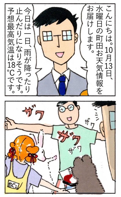 10月13日水曜日の町田のお天気情報です。 チーム町田くん、10月30日野津田公園で開催の #グリーンヨガフェスタ町田 参戦に向けて、頑張っておりま😆❣️ #グリヨガ #町田 #町田くん #漫画が読めるハッシュタグ #イラスト