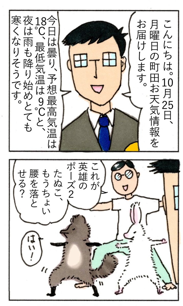 10月13日水曜日の町田のお天気情報です。 チーム町田くん、10月30日野津田公園で開催の #グリーンヨガフェスタ町田 参戦に向けて、頑張っておりま😆❣️ #グリヨガ #町田 #町田くん #漫画が読めるハッシュタグ #イラスト