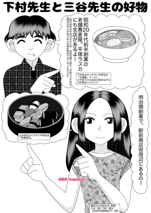 (拡散希望)湘南ひらつか応援したく、平塚市PR漫画イラスト発信だ! ①駅前商店街にあるラーメン屋「大黒庵」&寿司屋「若葉寿司」 ②ひらつか銘菓和菓子各種だ! #hiratsukagood #漫画が読めるハッシュタグ #絵描きさんと繋がりたい #和菓子 #グルメ好きと繋がりたい