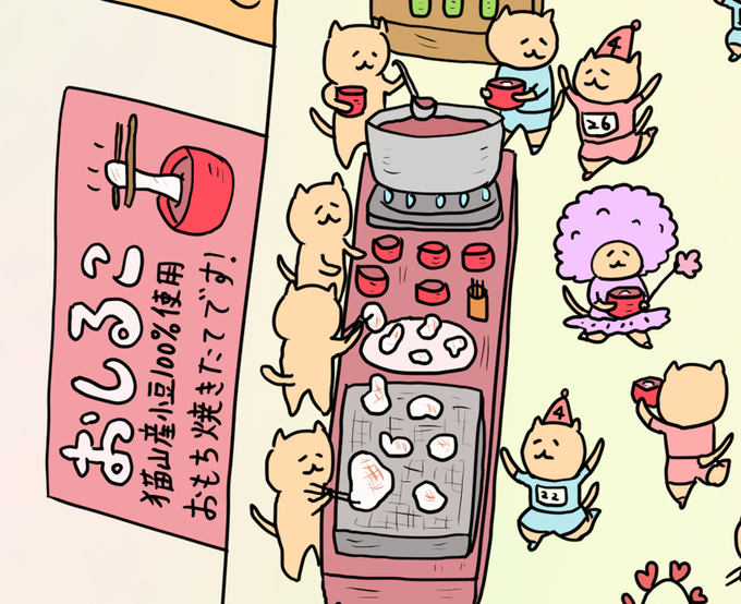 マラソン大会では猫山産小豆を使ったおしること猫山名物のカステラが人気👍 #グルメ好きな人と繋がりたい #グルメ #カステラ #おしるこ #イラスト好きと繋がりたい #絵描きさんと繋がりたい #drawings #Illustrations #絵本 #イラストレーター #お絵描き #ランニング