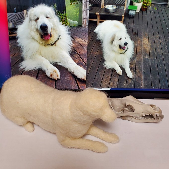 オーダーいただいたグレートピレニーズを作っています。 優しい顔つきの可愛い子がモデルなので、作りながらニヤニヤしてます。 また出来上がったら紹介しますね。 #羊毛フェルト #グレートピレニーズ