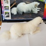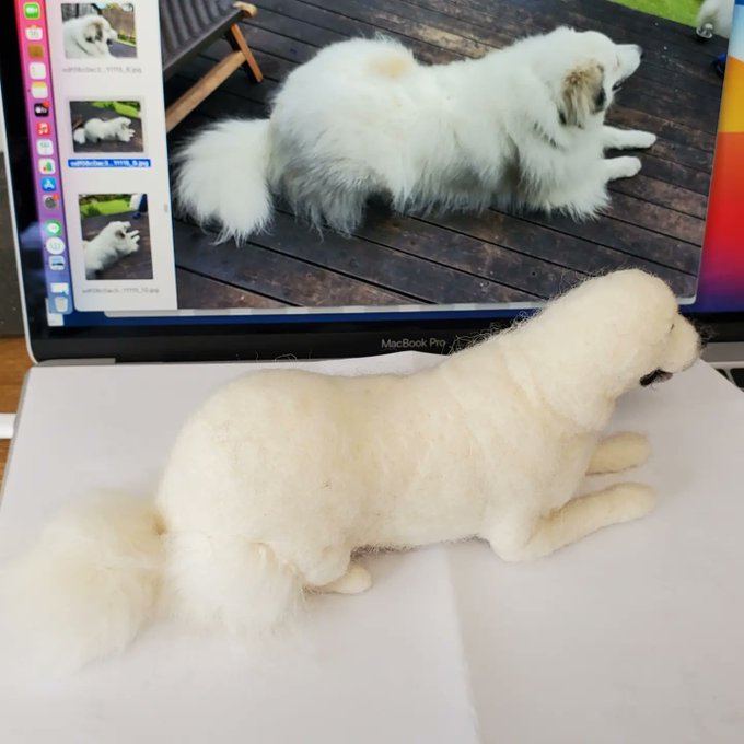 オーダーいただいたグレートピレニーズ、毛の重なりを考えて尻尾から前に向かって順番に植毛していくのですが、ついに首もとまで植毛が終わりました。 もちろんお腹も前足の毛もモサモサ植毛済み。 これから楽しみな顔周りを作っていきます。 楽しみ楽しみ。 #グレートピレニーズ #羊毛フェルト