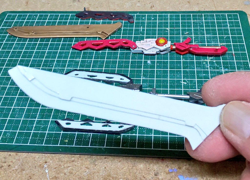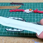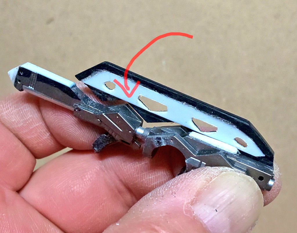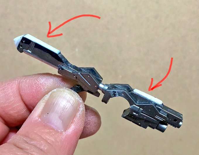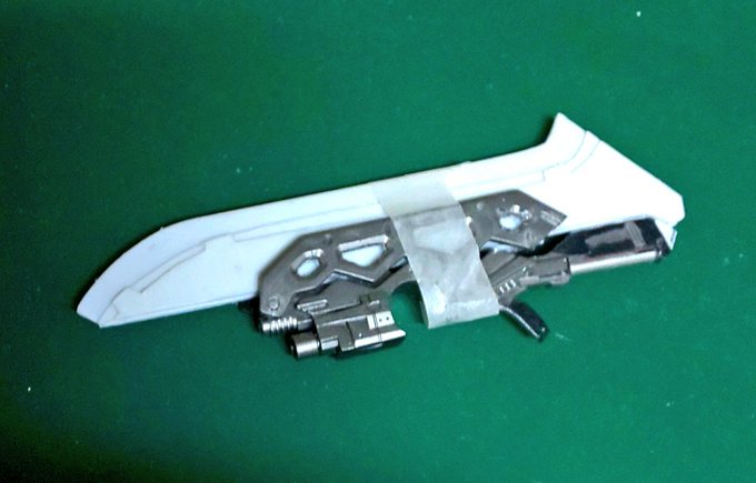 #アサルトリリィドール部 #グングニル改造 今やあそデジさんのメディア版 CHARMも売られていますが、 ここは改造します😅 ハンドルパーツは、形状変更が 必要で鋭角にします。 マガジンはカット、 ブレードも変わりますので スライド面を設けます。 刃は5枚構造プラ板で合わせ 3.0㎜厚を確保します