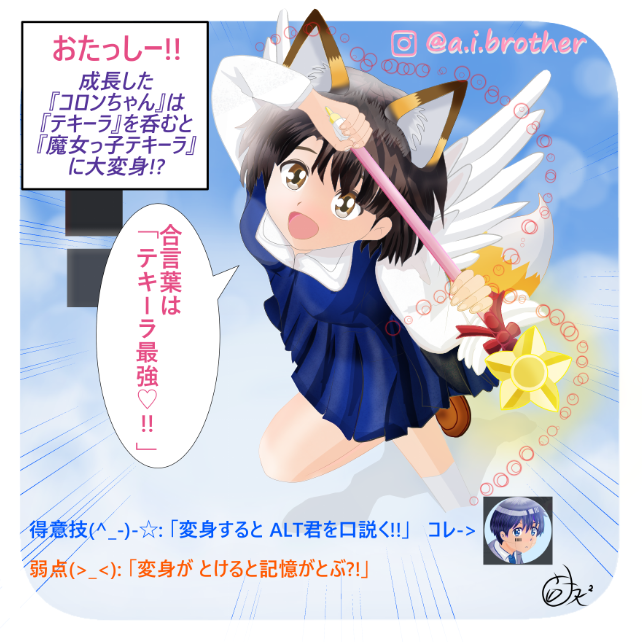 『魔女っ子 テキーラ』!? 得意技(^_-)-☆:『変身すると ALT君(A.I.Brother)を 口説く!!』 弱点(>_<):『変身が 溶けると 記憶がとぶ?!』 合言葉は『テキーラ最強♡!!』 #anime #manga #イラスト #絵柄が好みって人にフォローされたい #絵描きさんと繋がりたい #ケモノミミ