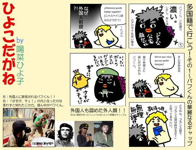 この顔のせいか、旅先でも街中でも 外国人とすぐに仲良くなれるパフくん。 これはもはや特技だがね。 詳細はコチラ ameblo.jp/hiyoko-dagane/… #ひよこだがね #イラスト #4コマ漫画 #過去作 #漫画が読めるハッシュタグ #絵描きさんと繋がりたい #ゲバラ