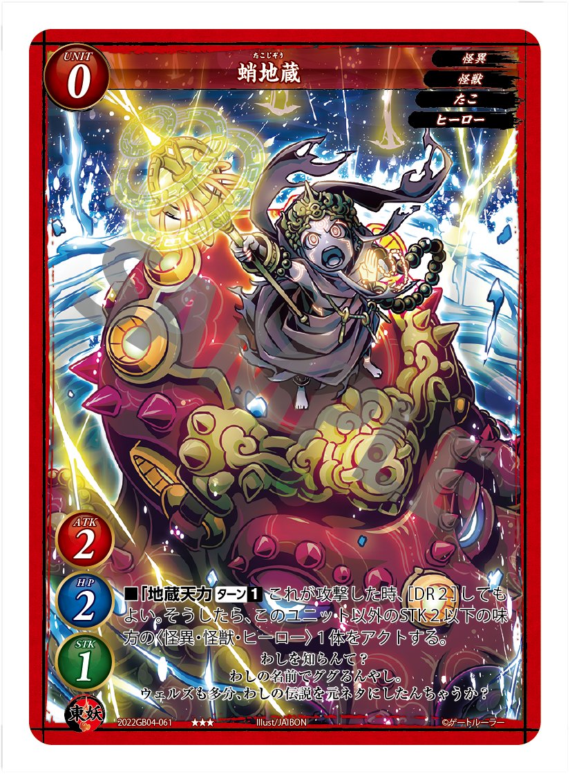 本日2022年3月31日発売!TCG「ゲートルーラー」第4弾「装着!俺がヒーローだ!」にて 【蛸地蔵】のイラストを担当させていただきました!よろしくお願いいたします〜! gateruler.jp #ゲートルーラー