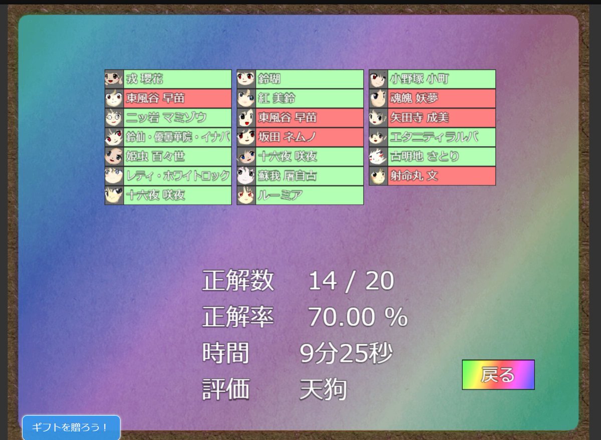 このゲーム6月までしかできないのでぜひ遊んで。 私の結果はこうでした。 ZUN絵クイズ game.nicovideo.jp/atsumaru/games… #gm4409 #ゲームアツマール