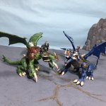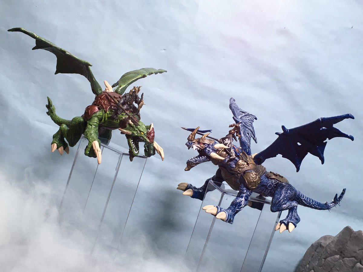 #夜のフィギュア撮影会 お題『コレクション』 珍しいコレクション!?戦う竜騎士!善と悪のドラゴンライダー!←昔のドラゴン・フィギュアにGWのミニチュアを乗せてみた😄 #メガブロック #ドラゴンエッグ #ブレトニア #ケイオスナイト #ゲームズワークショップ #ミニチュア #miniature #オモ写