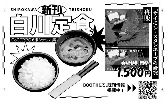 ゲームマーケット2022秋2日目(10/30) 【白川奇譚】出店します🎉 既刊「サイモン・スタンホープの研究」再販と、シナリオ4本詰めた新刊【白川定食】を頒布する予定です。画像はサークルカット。今回ミニゲーム風なシナリオ多めかも🤔 よろしくお願いしますー! #ゲームマーケット2022秋 #白川奇譚