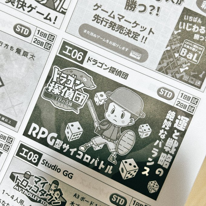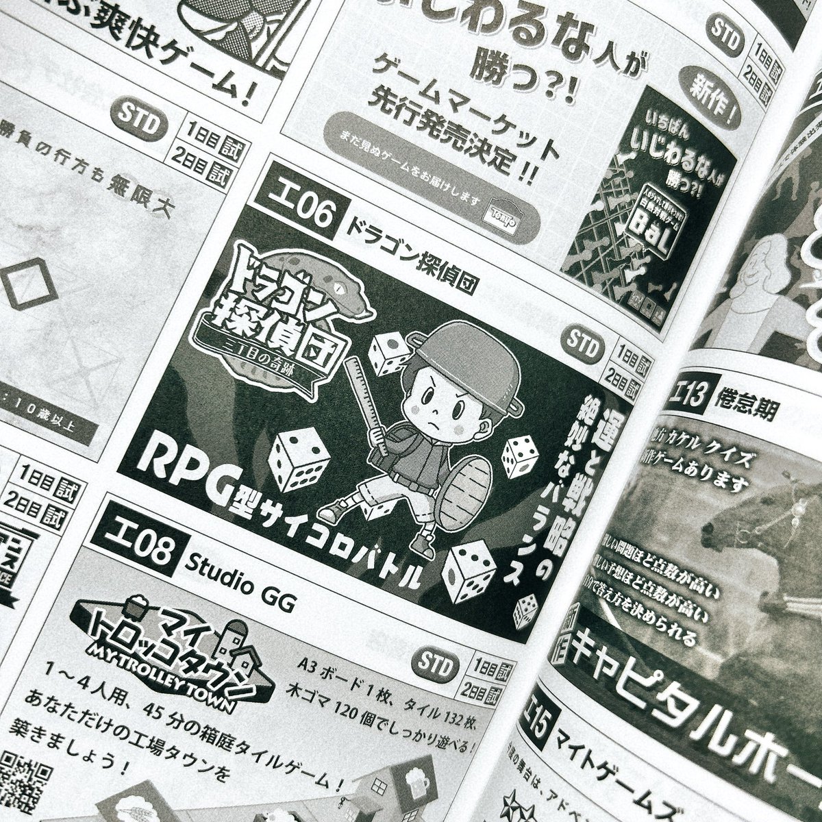 ゲームマーケットのカタログに1日目89ページ、2日目160ページに「ドラゴン探偵団」(エ06)のサークルカット掲載されています。ボドゲ取り置きまいります。 forms.gle/LQczTHi26VpZ7x… #ゲームマーケット2023春