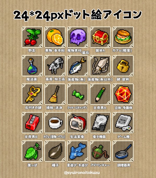 24*24pxドット絵アイコンシリーズ BOOTHとDLsiteで販売中! BOOTH syuironoitokuzu.booth.pm/item_lists/mgK… DLsite dlsite.com/home/fsr/=/key… 利用規約 ci-en.net/creator/8922/a… #ドット絵 #ゲーム素材 #アイコン素材 #pixelart