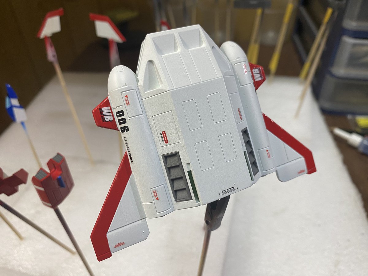 #ガンプラ #ガンプラはどんな自由な発想で作ってもいいんだ #ガンプラの画像貼るとRTされると聞いて #旧キット #コアブースター #コアファイター #カスタムペイントshaftD #セイラマス 塗り分けが終わったので、デカール貼り 貼り過ぎは嫌いなので程々に今回はセイラさん機に