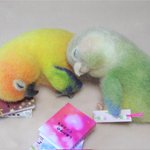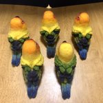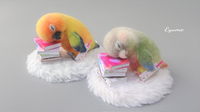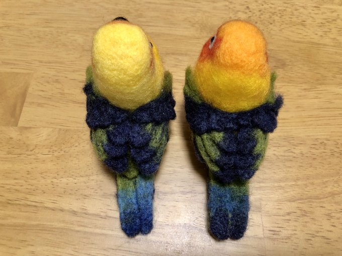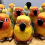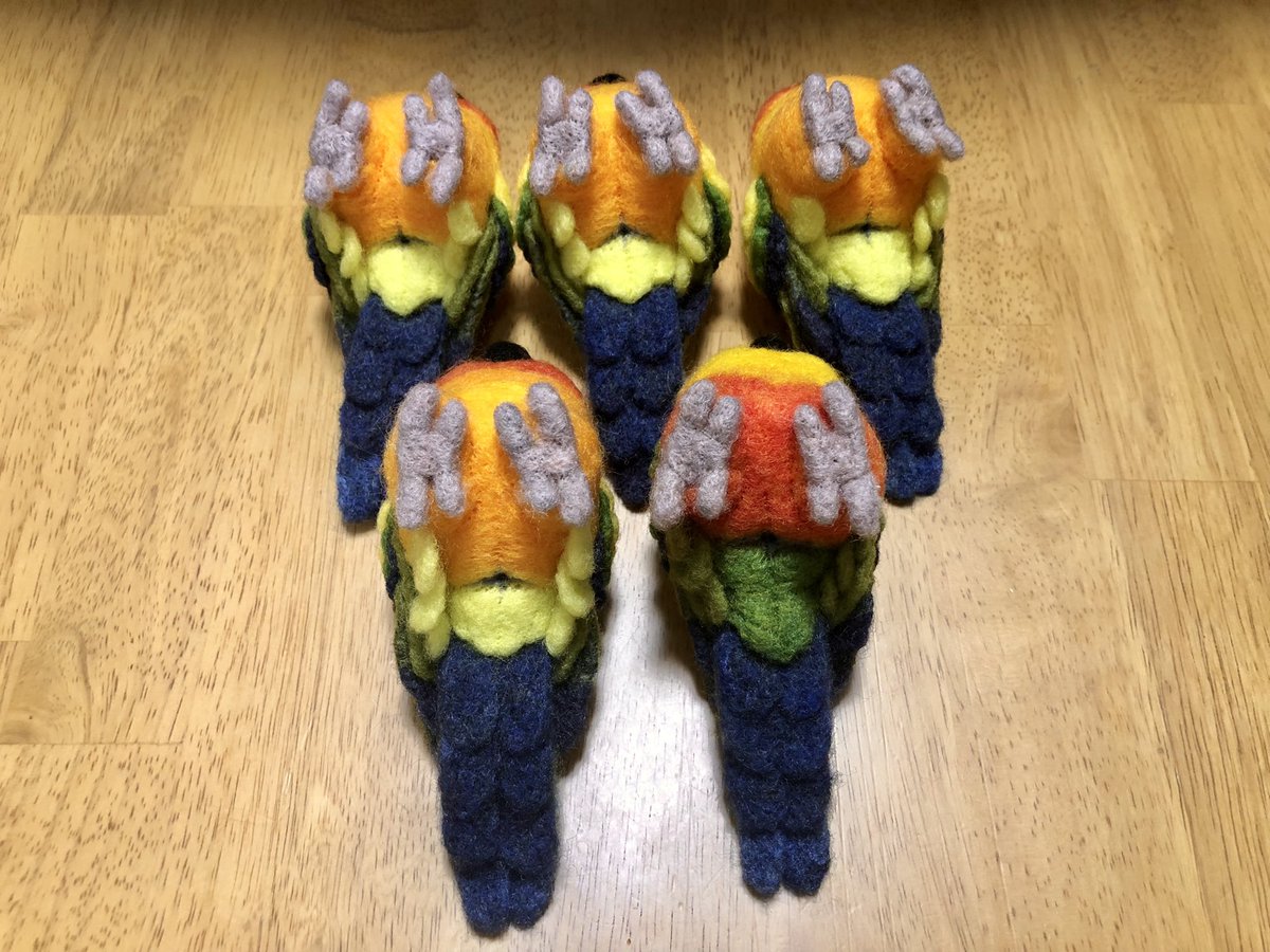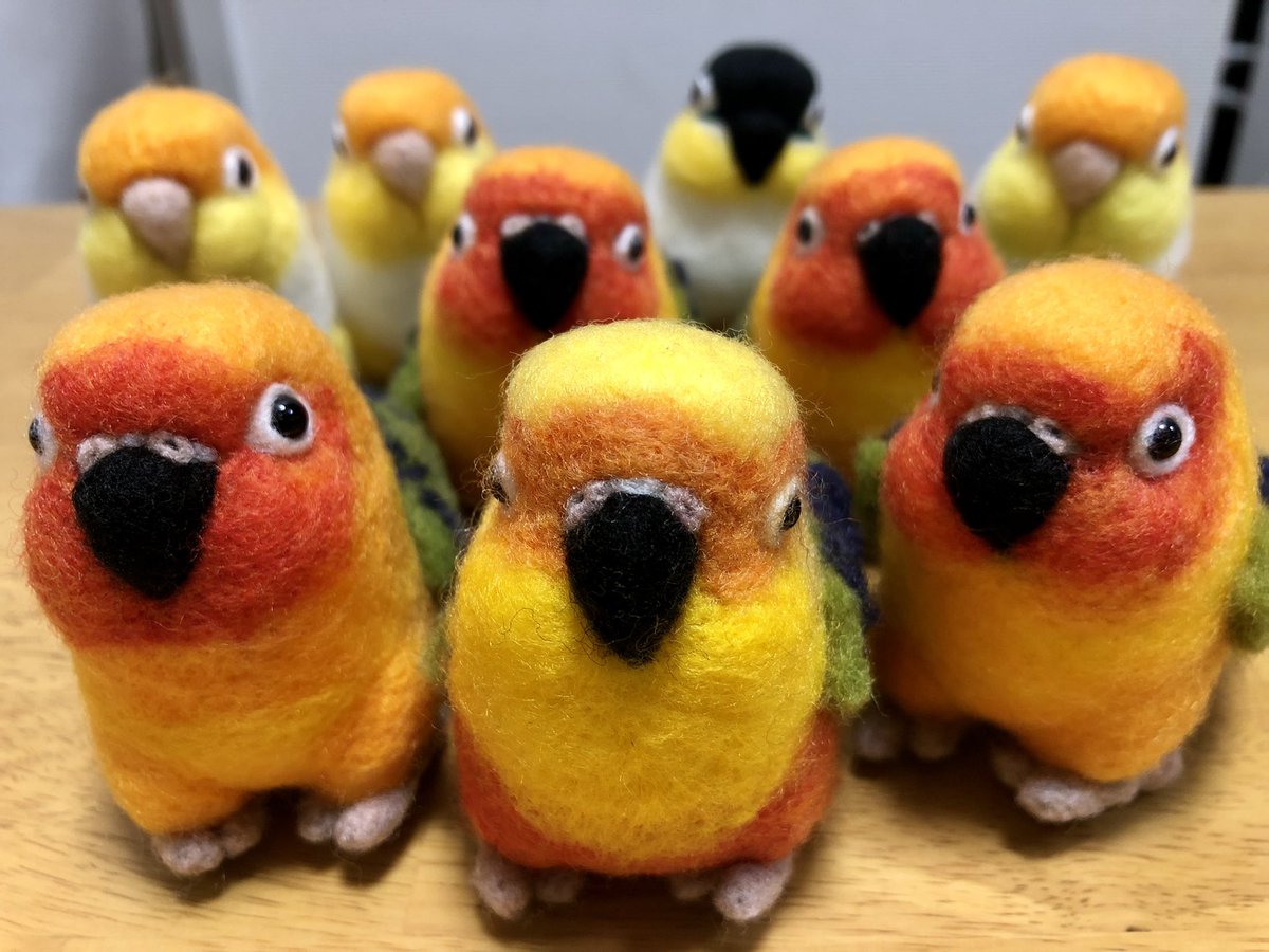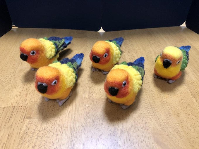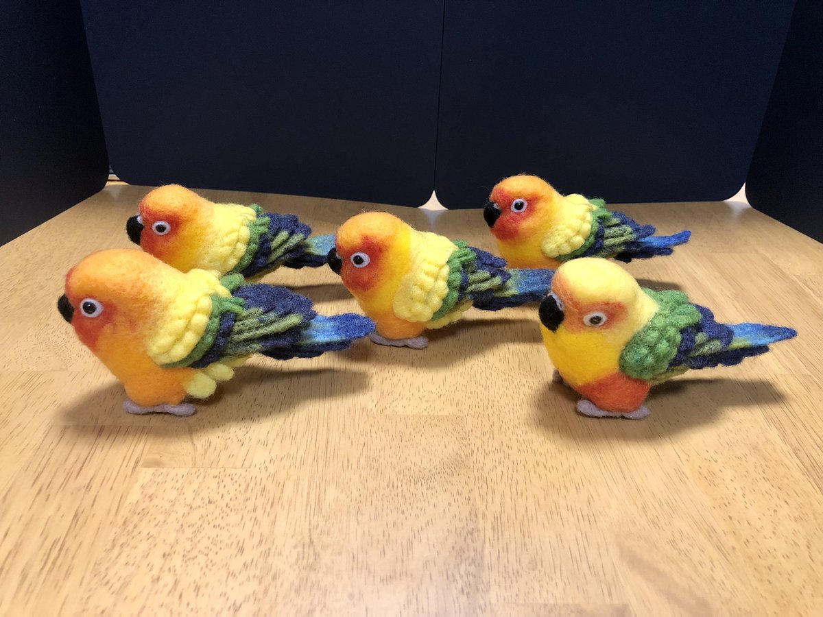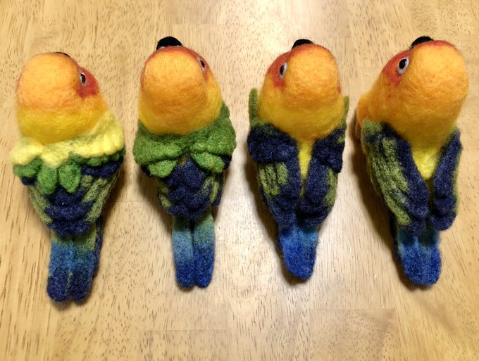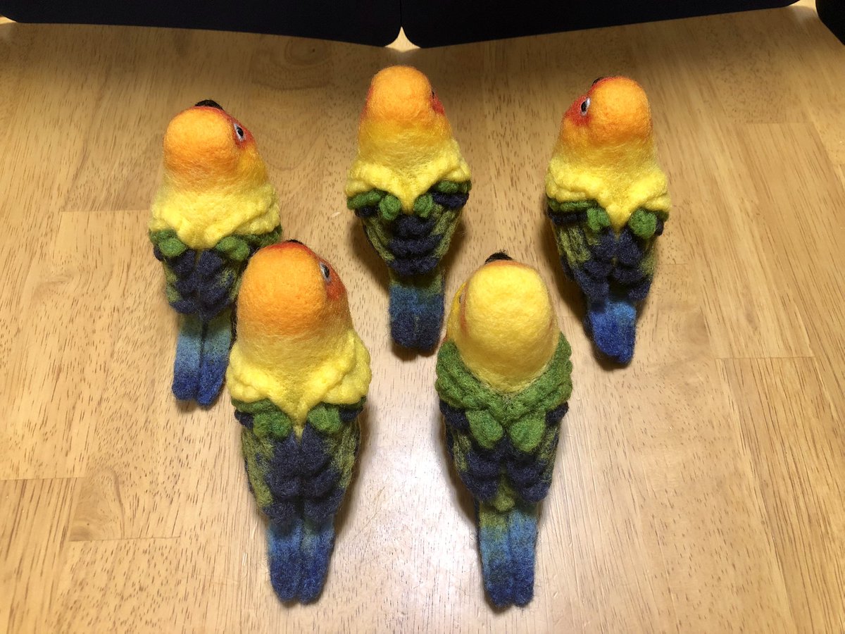 【羊毛まる鳥】コガネメキシコインコ4羽、ナナイロメキシコインコ1羽の完成しました。一度に5羽並行作業でドツいたの初めてだったのでなかなかタフな作業でした #羊毛フェルト #柑橘戦隊 #コガネメキシコインコ #ナナイロメキシコインコ twitter.com/GU_JIN/statu…