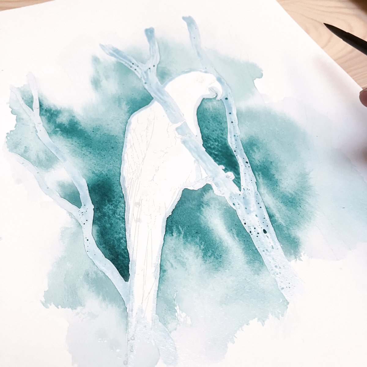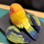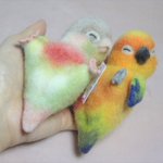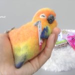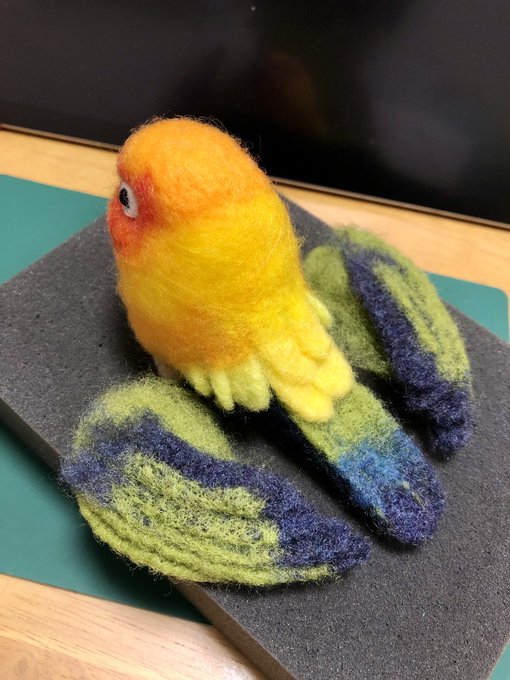 雨覆羽1段目を2羽分だけ搭載 平日は作業時間あまり取れないのでこんなもん コラコラキミたちくん 作業が遅いって詰め寄らない 戦隊じゃないキミたちも参加しない #羊毛フェルト #柑橘戦隊 #コガネメキシコインコ #ナナイロメキシコインコ