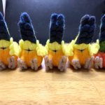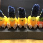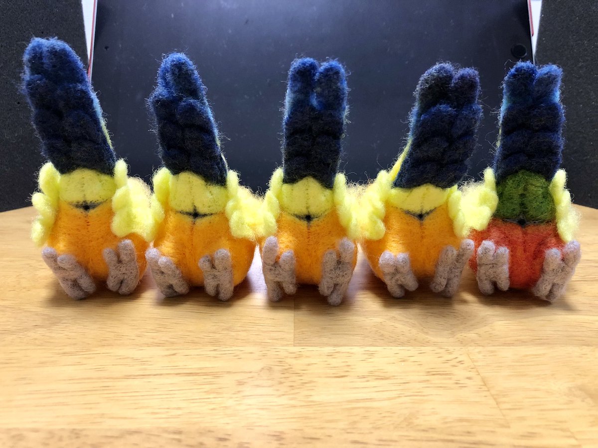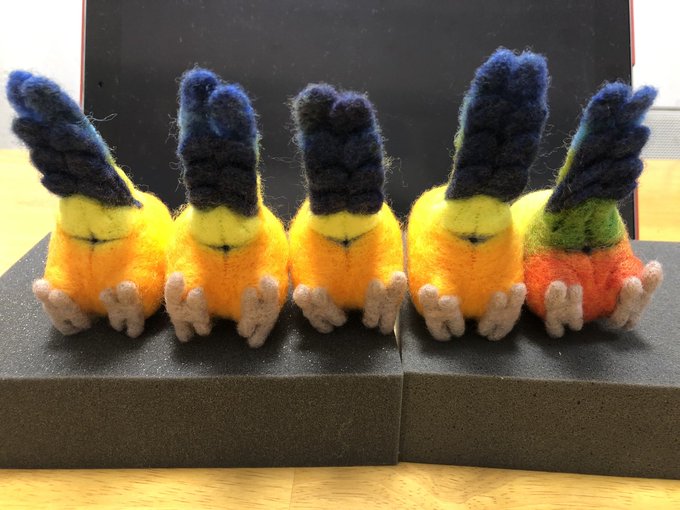 全国三千万人のおへんたいの皆様お待たせしました。あなた方が大好きな「おちり」本日仕上がりました 1枚目:おちり完成 2枚目:おちり周囲羽根付き 3枚目:進捗報告(誰に?) #羊毛フェルト #柑橘戦隊 #コガネメキシコインコ #ナナイロメキシコインコ