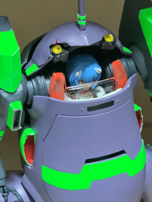 #コクイットカバーの開いた状態を貼る これも既出ですが、 #メカトロウィーゴ 1/20改造の初号機です。 コラボ初号機が出てるので、今となっては微妙な存在に・・・💧 パイロットは、#ミクロマン な綾波さんですん