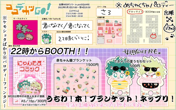 うちわと本とちょぴっとブランケットと折り本があります!よろしくお願いします! いつも通りケモショタパロディーファンタジーですが、折本は生活と出勝の不思議イラストです。 #ココデカツGO #ココデカツお品書き