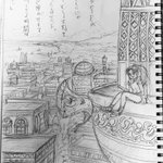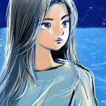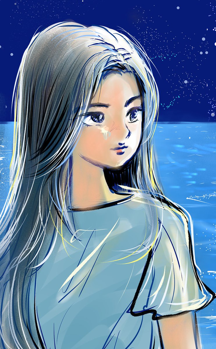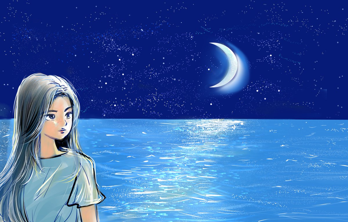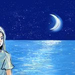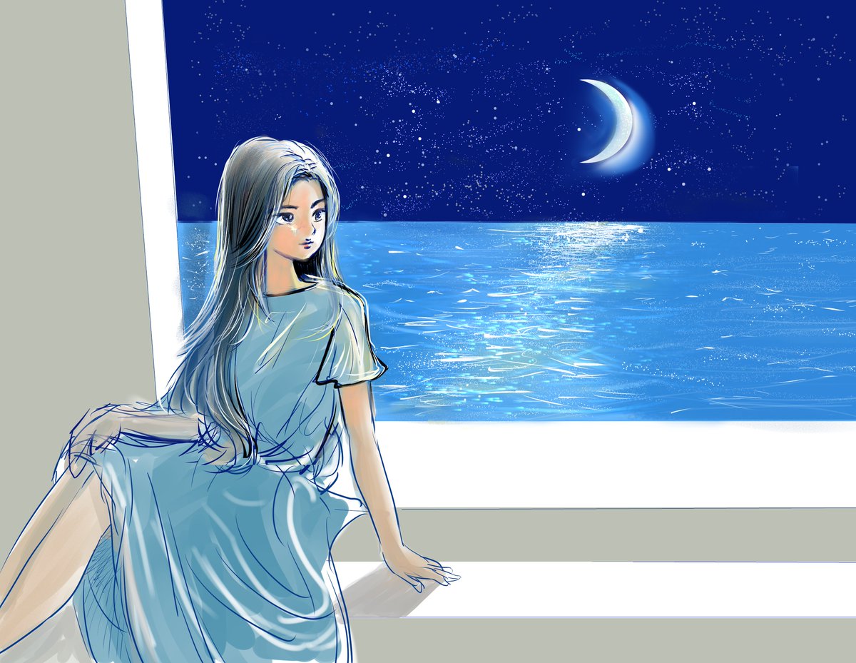 ココミンが宮殿から海を眺めている (イメージ図) 過去絵に加筆です。 月の光はどこか優しく、人を過去へと誘いますね。 過去も未来も本当は一つなのかもしれません。 おやすみなさい。🦄 #ココミン #Dreaminblue #デジタルアート