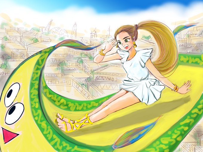 絨毯 「いくぞ~!つかまって!」 ココミン 「つかまるって!!? どこをつかむのよのよぉぉぉぉ!」 これで完成です 絨毯、細かく描くのがめんどっち(^▽^;) #イラスト #ココミン twitter.com/yayoi_kazu/sta…
