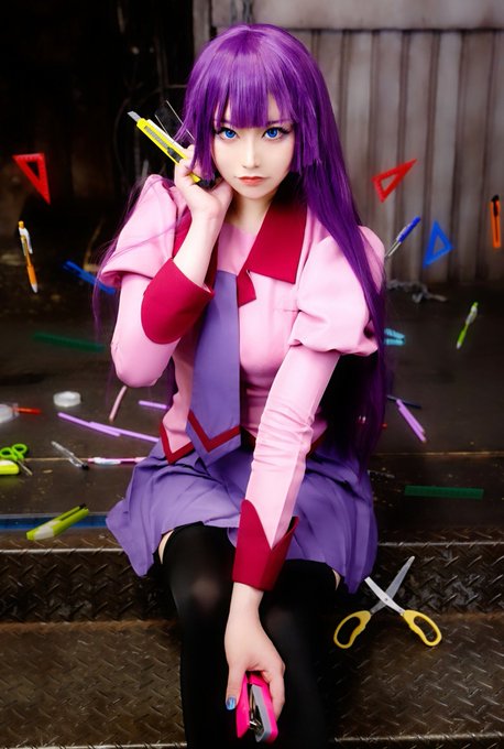【作品名】 化物語 【キャラクター名】 戦場ヶ原ひたぎ 【一言】 背景の文房具は透明のテグスを両サイドの手すりに数本結んで張り、文房具を裏からテープで固定し浮いてるように見せています。 #コスモスナップ011 #COSPLAYMODE