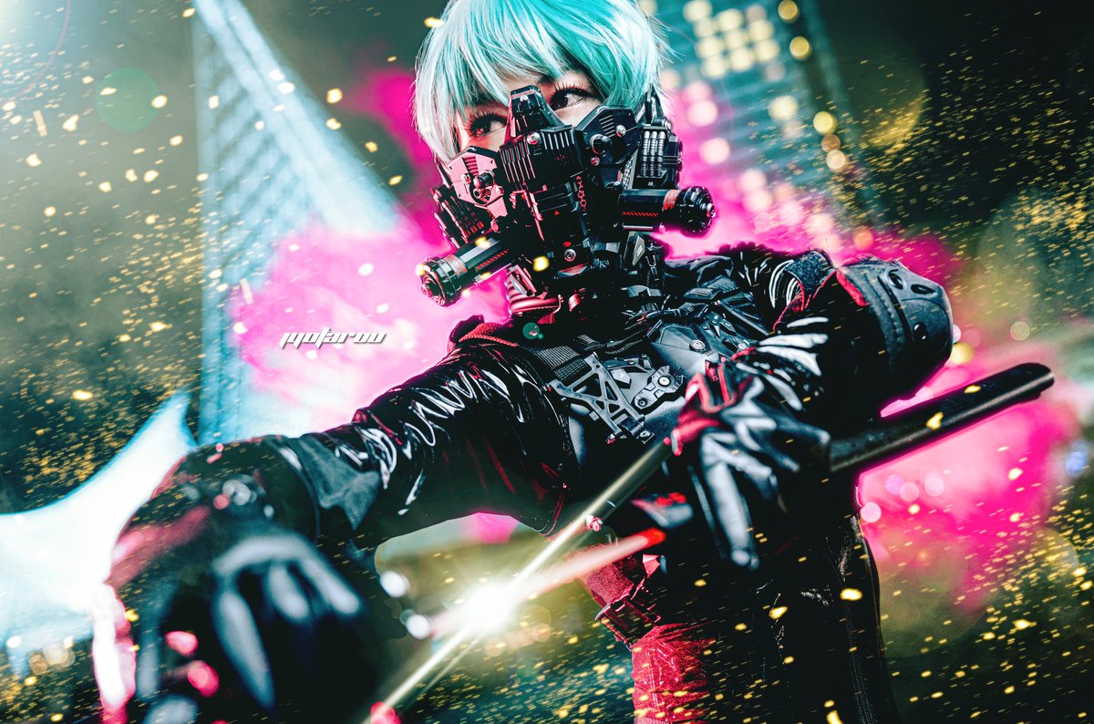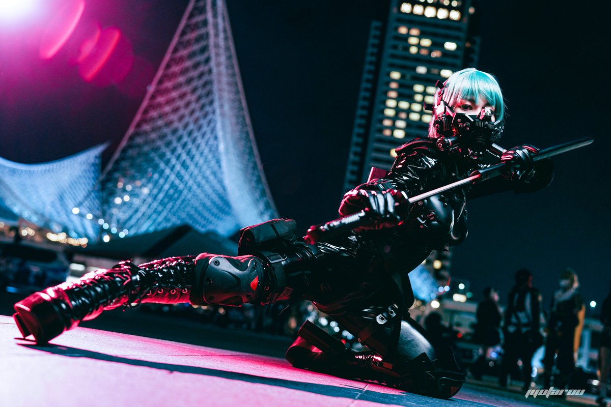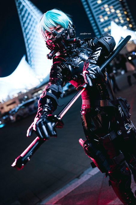 【作品名】創作 【キャラ名】サイバーパンク 【一言】初めて夜撮影した写真です。かみこすの夜景とライトで近未来感が出るようエナメル素材衣装を選びました。臨場感が出るよう軽装武器にポージングで戦闘感を意識しました。 📸 @JYOTAROU_PG 装備 @UEDAJYOKO #コスモスナップ05 #コスモスナップ