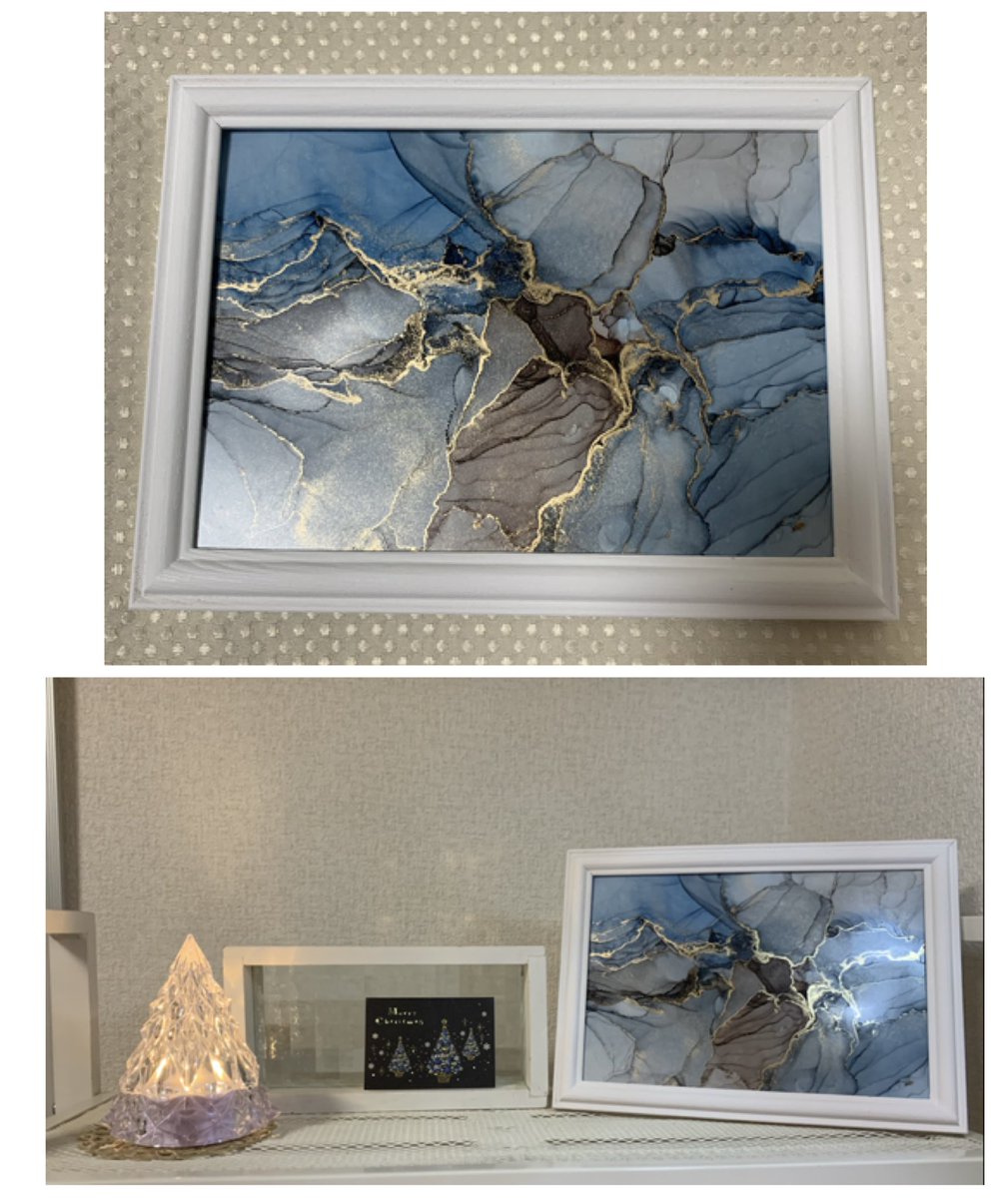 フレームで変わる印象😶 家族曰く 上は病院の壁に掛かってそうななんかわからん絵🤔 下はインテリアでもおかしくない なんかわからん絵に見えるとのこと どっちにしても何かわからんモチーフが出来上がりました(;´д`) #コピック #コピックインク #アルコールインクアート