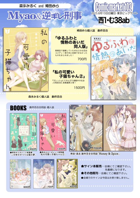 明日8/13(日)コミケ2日目に参加します。西1む38ab「Myao」袴田めらさん「逆ギレ刑事」と隣接合同会計です。 新刊はありませんヽ(;▽;) 子猫ちゃん2巻の再販分があります。 あとイラストサイン本作れたら持って行きます。 #コミケ102お品書き #C102
