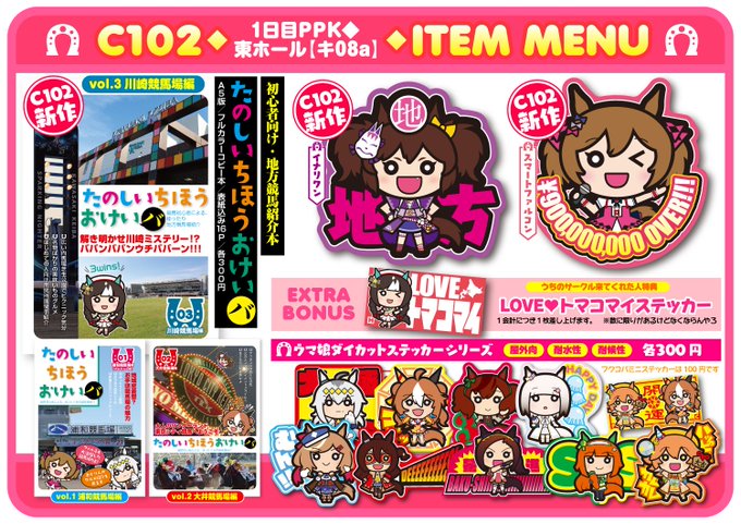 【C102お品書き②/1日目東ホール[キ08a]】 こちら全部のお品書きになります〜!!! 🐎今回は川崎競馬場本 🐎新作シールは2種類 🐎特典は「LOVE♥トマコマイ」ステッカー 去年出ししたものも一通り持っていきますので、是非遊びにきてくださいませ〜🙏 #C102 #C102お品書き #コミックマーケット101