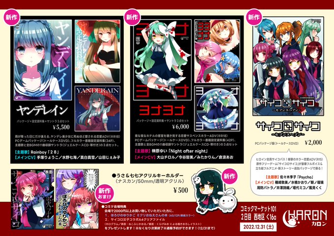 #コミックマーケット101 #C101 冬コミお品書きです! 新作ヤンデレホラーゲーム3点と会場特典もあります! 2日目西く16a「CHARON」でお待ちしてます✨ ●新作ゲーム ・ヤンデレイン ・ヨナヨナ ・サイコロサイコ-セブンスヘブン- ▼通販 ※再販・特典予約は12/31まで! charon-fuji.booth.pm