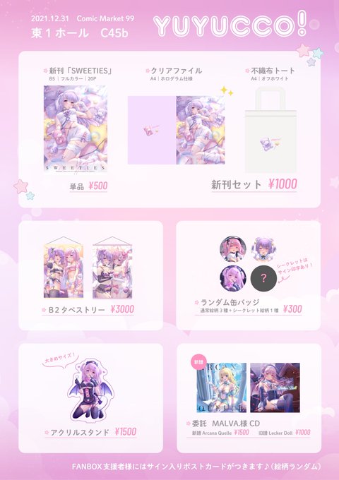 C99のお品書きです🎀🤍 コミックマーケット99 12/31(金) 2日目 東1ホール C45b『yuyucco!』 全て初出グッズです。後日、グッズはboothで通販、新刊はメロンブックス様に委託を予定しています♪ どうぞよろしくお願いします🌸 #C99 #コミックマーケット99