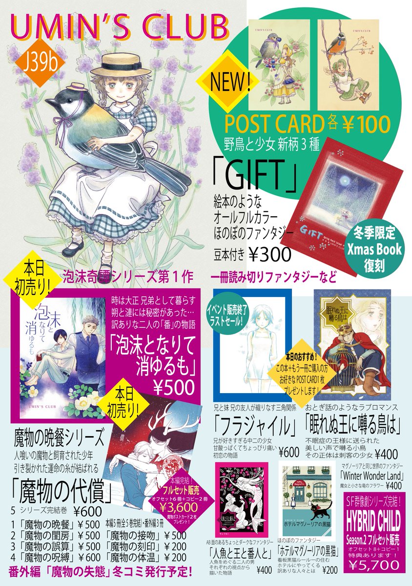 COMITIAお品書きです。初売りはこの2冊!魔物の代償」本編全5巻の完結巻!新シリーズも始動「泡沫となりて消ゆるも」。オールフルカラーのXmas本の復刻!ペーパーも製作中です! #COMITIA142 #コミティア142 #コミティアお品書 BOOTH uminsclub.booth.pm BOOK☆WALKER bookwalker.jp/author/106649/