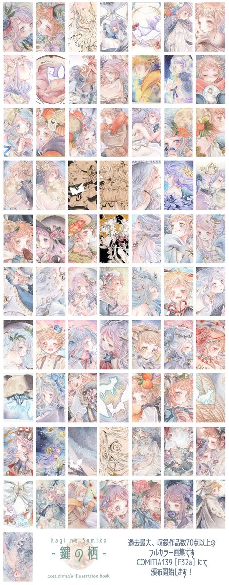【- おしらせ -】 入稿データにミスがなければ #コミティア139 にて 過去最大級の収録作品数を誇る(笑) 「ぼく」とマリーの冒険を とじこめたフルカラー画集 『鍵の栖』を発行します😳✨ 過去最大のページ数& 紙質・装丁にも拘った一冊🌟 ぜひよしなに~🌸 #COMITIA139 #コミティア139お品書き