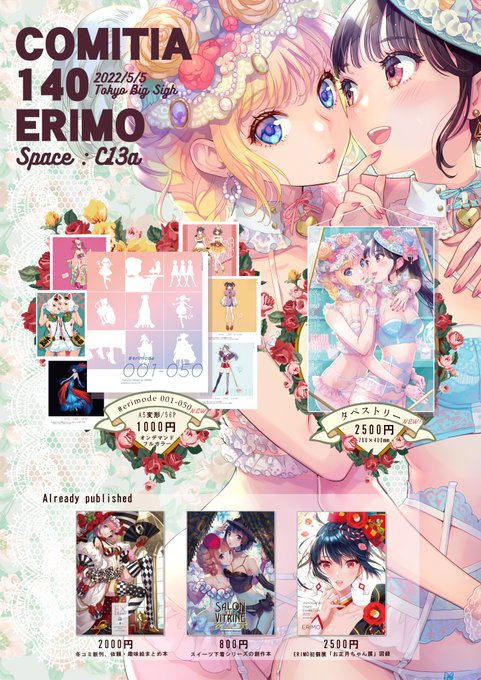 【COMITIA140 * お品書き】 新刊とグッズ、色紙などを販売いたします。 ぜひ見にいらしてください! 日程:2022年5月5日(木/祝)11:00~15:00 場所:東京ビッグサイト スペース:C13a 「ERIMO」 #コミティア140 #COMITIA140 🛒通販はこちら erimo.booth.pm