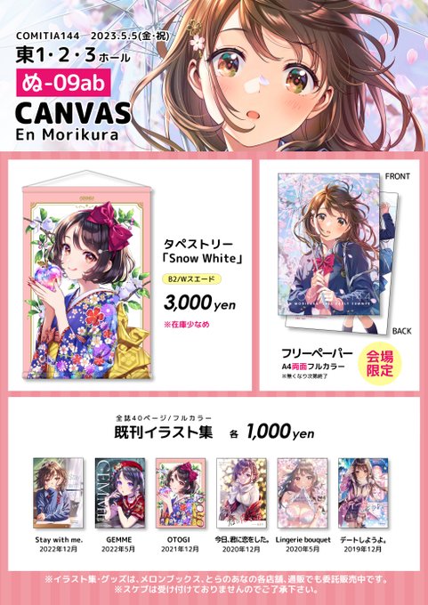 【5/5 #コミティア144 お品書き】 会場限定フリーペーパー、タペストリー、既刊イラスト集6種を頒布します。 [ぬ-09ab、CANVAS]にてお待ちしております✨ 🌸イラスト集・グッズ通販はこちら melonbooks.co.jp/circle/index.p… twitter.com/i/web/status/1…