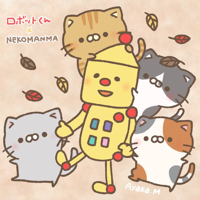 #コラボイラスト企画 13人目はトムハチさん(@tom8hotmail365)のロボットくん🤖4匹と一緒に秋のお散歩🍂 ロボットのかっこよさにみんな懐いています|・ω・*)大変お待たせしました🙇♀️!コラボありがとうございました(灬ºωº灬)🍁 #NEKOMANMA #イラスト #ゆるいイラスト