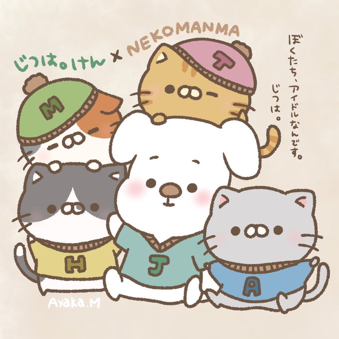 #コラボイラスト企画 14人目はじつは。けんさん🐶(@jitsuwaken)寒くなってきたので、4匹もじつは。けんちゃんと同じニットや帽子を着だしました(•ө•)🧶そしてちょっとした、じつは。情報も|・ω・*) 大変お待たせしてすみません!コラボありがとうございました💐 #NEKOMANMA #イラスト